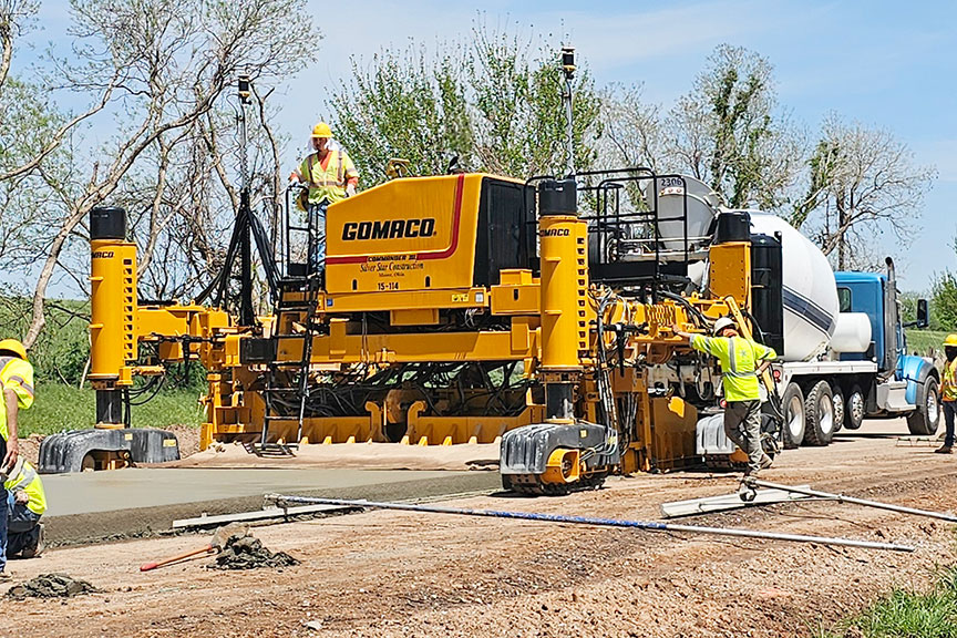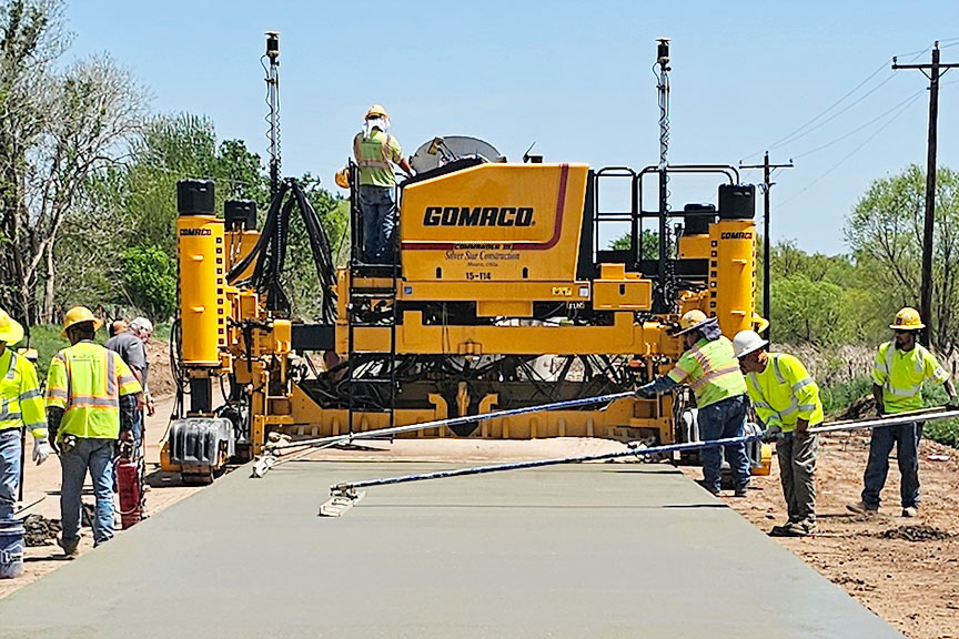 A four-track GOMACO Commander III with Topcon 3D guidance is slipforming a concrete roadway in Dover, Oklahoma.
