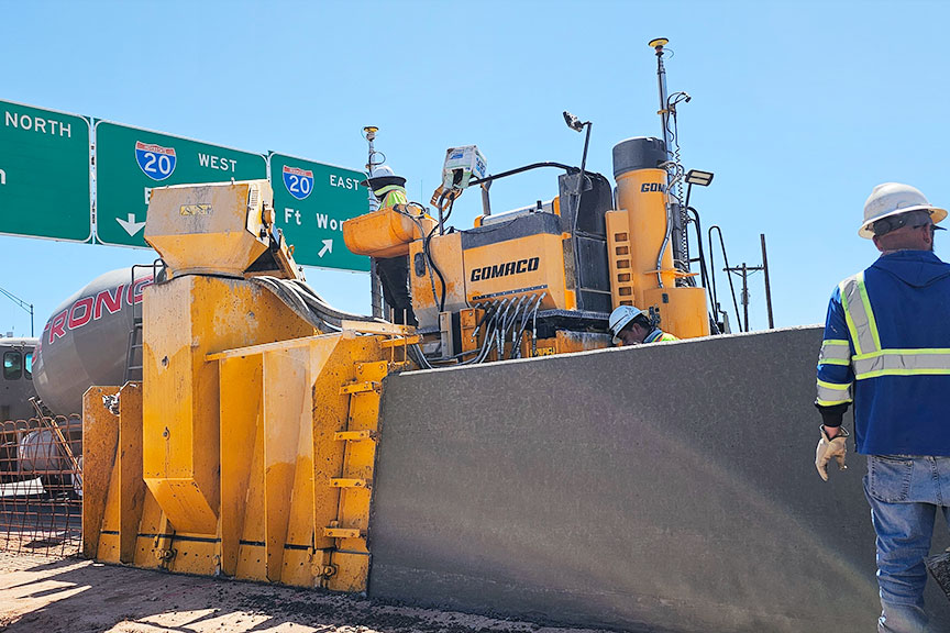 An Xtreme three-track GOMACO Commander IIIx with Leica iCON 3D guidance is slipforming barrier on U.S. Highway 83 and 277 at the I-20 interchange in Abilene, Texas.