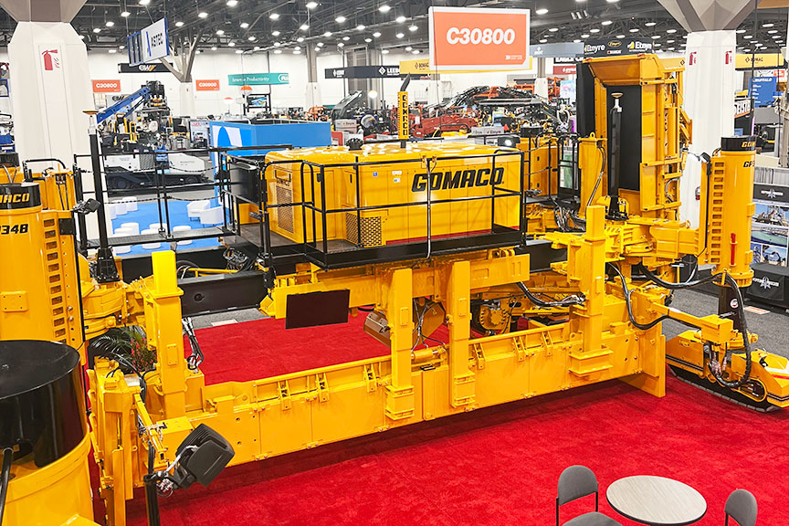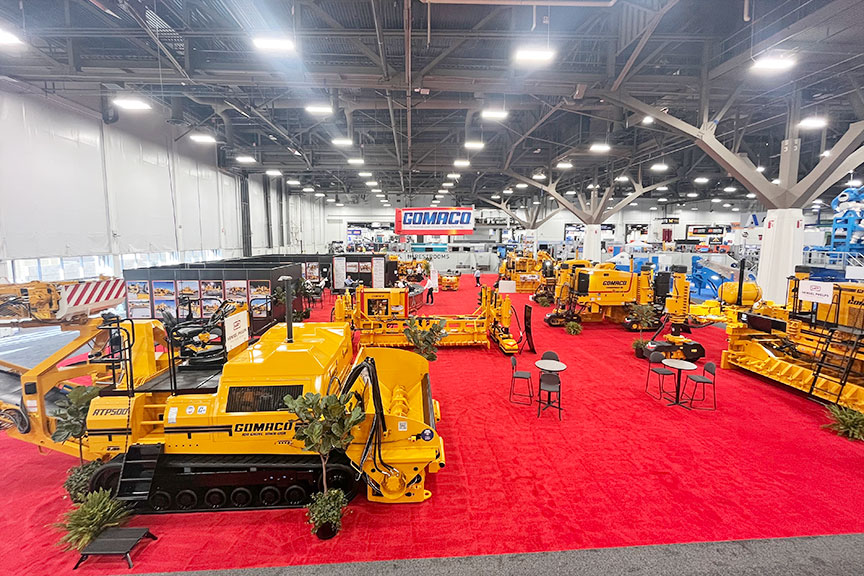 Our booth display includes an Xtreme Commander IIIx for curb and gutter, Xtreme Commander IIIx for transverse sidewalk, Xtreme GT-3600 curb and gutter machine, GT-3200 curb and gutter machine, Curb Cadet, 3300 for right-hand barrier, four-track GP-2400 slipform paver, four-track GP4 slipform paver, GP348 placer/spreader slipform paver, T/C-5600 texture/cure machine, RTP-500 rubber-tracked placer, C-450 cylinder finisher, and the brand new Polymer Paver.