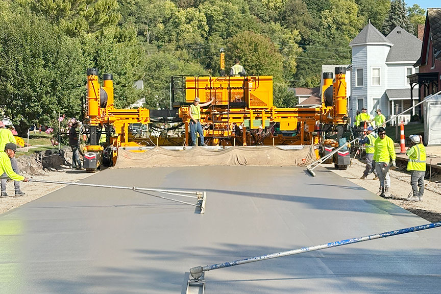 This four-track GOMACO GP-2400 is municipal paving on North Fourth Street in Bellevue, Iowa.