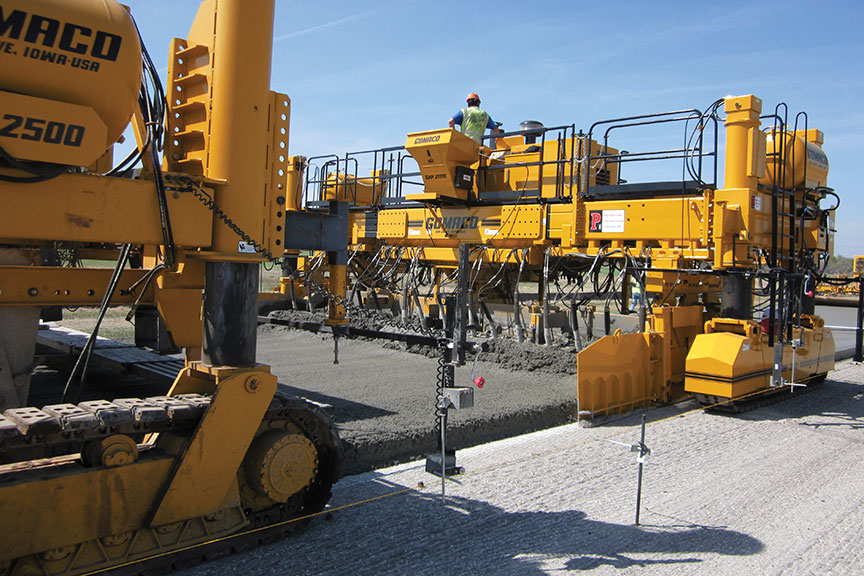 This contractor slipformed 7728 cubic yards (5908 m3) of concrete in a 12.5-hour day at the O’Hare International Airport in Chicago. They utilized two GOMACO 9500 placers, a PS-2600 placer/spreader, and a GHP-2800 slipform paver. The paver and placer/spreader on the project used a 3D stringless guidance system.