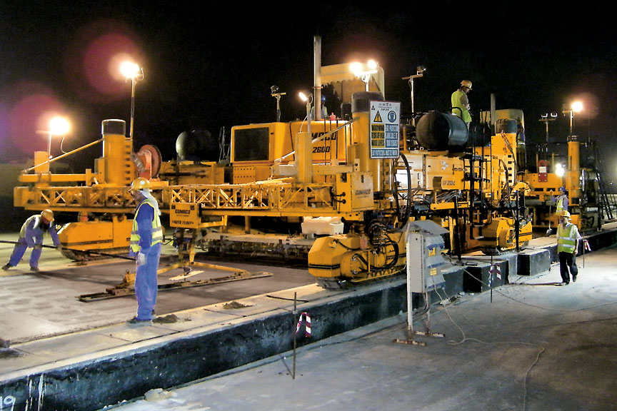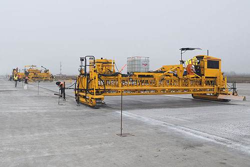This contractor slipformed 44,000 m2 (52,625 yd2) of concrete apron at the Charles de Gaulle International Airport in France. The four-track GHP-2800 was equipped with a 3D guidance system.