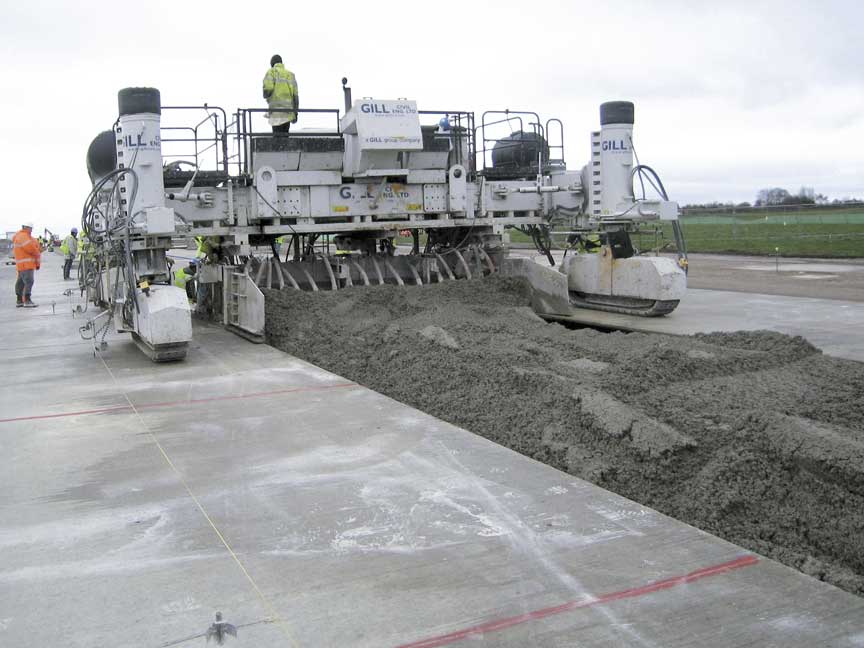 The taxiway and runway project at the Leeds and Bradford Airport in Leeds, England, called for 16,744 square yards (14,000 m2) of concrete. The new taxiway/runway was built over the existing one that had been planed down, and the contractor used a GOMACO GHP-2800 slipform paver.