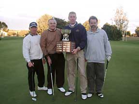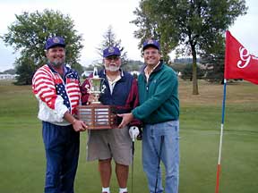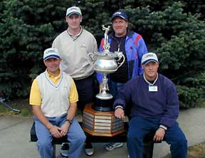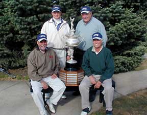 Claiming the Grand Championship title for 2000 was the foursome of, from left, Jim Fischer of Jim Fischer Construction Co., Jim Beaudoin of William Beaudoin & Sons, Brad Barkema of GOMACO Corporation and Mike Swanston of Swanston Equipment. They also won the Scramble Tournament on the Holstein Golf Course. |
