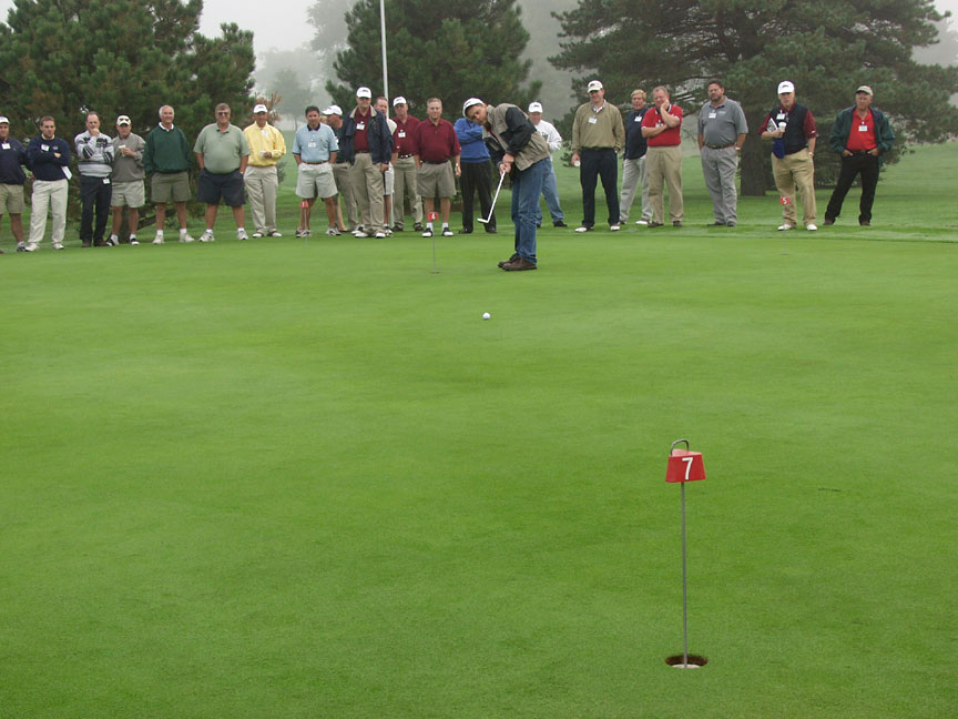 Five Invitational attendees had the opportunity to compete to sink a 50 foot, $5,000 putt on Wednesday morning. At the Tuesday evening awards ceremony, five names are drawn to compete in a putt-off. The winner of that competition had the chance to sink the $5,000 putt sponsored by Buddy Shelton! This year the participants were Dwight Savage of Eaton, Jeff Bryan of CON-E-CO, Larry Smith of Road Machinery & Supplies Co., Ron Efferding of Murphy Tractor & Equipment Co. and Wendell Shirley of Shirley Concrete Co. After the putt-off, Ron Efferding earned the honor of attempting to sink the 50 foot putt. Despite an excellent effort, his putt missed the hole by approximately one foot. -- Select Any Photo For A Close-Up --