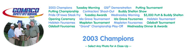 2003 Invitational Home - 2003 Champions - Tuesday Morning - GSI® Demonstration - Putting Tournament - Putting Finals - Contractors' Shoot-Out - Buddy Shelton Show - Pride Of Iowa Steak Fry - Tuesday Awards - Wednesday Morning - $5,000 Putt & Buddy Shelton - Opening Ceremony - Ida Grove Tournament - Ida Grove Foursomes - Holstein Tournament - Holstein Foursomes - Mapleton Tournament - Mapleton Foursomes - Odebolt Tournament - Odebolt Foursomes - "Grand" Championship Play-Off - Wednesday Dinner & Awards