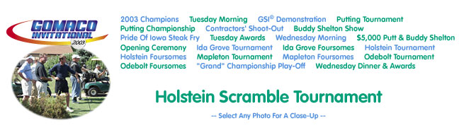 2003 Invitational Home - 2003 Champions - Tuesday Morning - GSI® Demonstration - Putting Tournament - Putting Finals - Contractors' Shoot-Out - Buddy Shelton Show - Pride Of Iowa Steak Fry - Tuesday Awards - Wednesday Morning - $5,000 Putt & Buddy Shelton - Opening Ceremony - Ida Grove Tournament - Ida Grove Foursomes - Holstein Tournament - Holstein Foursomes - Mapleton Tournament - Mapleton Foursomes - Odebolt Tournament - Odebolt Foursomes - "Grand" Championship Play-Off - Wednesday Dinner & Awards