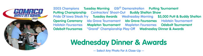 2003 Invitational Home - 2003 Champions - Tuesday Morning - GSI® Demonstration - Putting Tournament - Putting Finals - Contractors' Shoot-Out - Buddy Shelton Show - Pride Of Iowa Steak Fry - Tuesday Awards - Wednesday Morning - $5,000 Putt & Buddy Shelton - Opening Ceremony - Ida Grove Tournament - Ida Grove Foursomes - Holstein Tournament - Holstein Foursomes - Mapleton Tournament - Mapleton Foursomes - Odebolt Tournament - Odebolt Foursomes - "Grand" Championship Play-Off - Wednesday Dinner & Awards