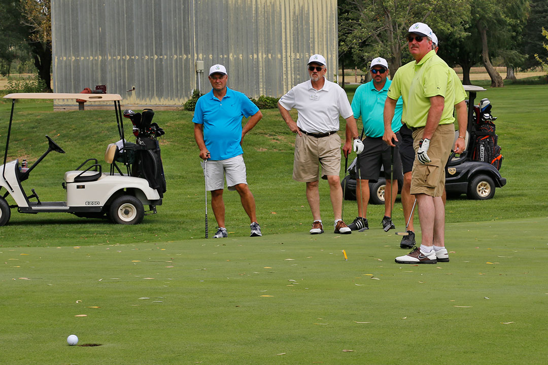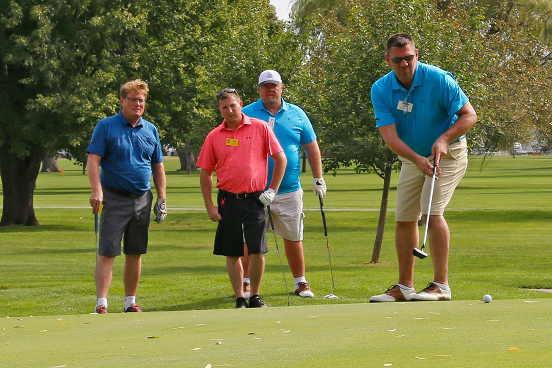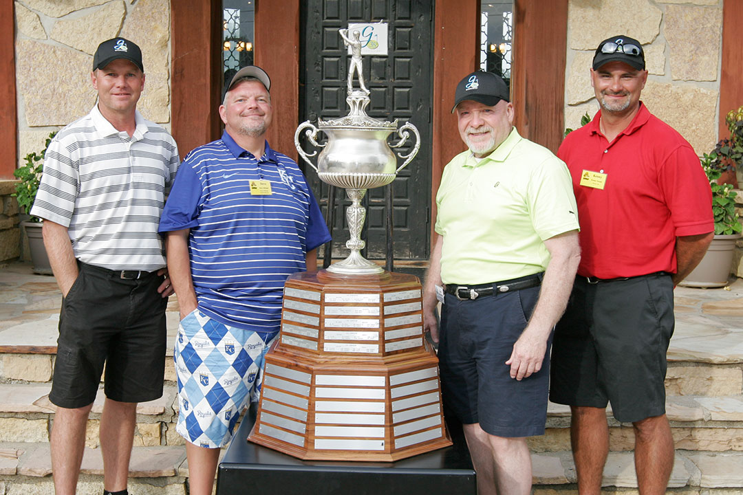 Winning first place in the Mapleton Scramble Tournament was the foursome of David Barthel of Faris Machinery, Steve Michael of Turner-Michael Construction Co., Sam Finocchio of Durst Div./Regal-Beloit Corporation, and Kenny Turpin of Pavers, Inc. They finished the Mapleton tournament with a score of 59, which was 11 under the course par of 70.