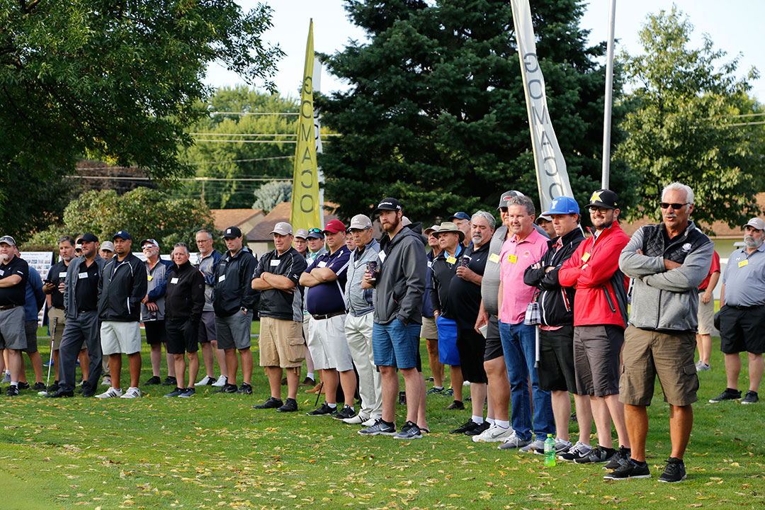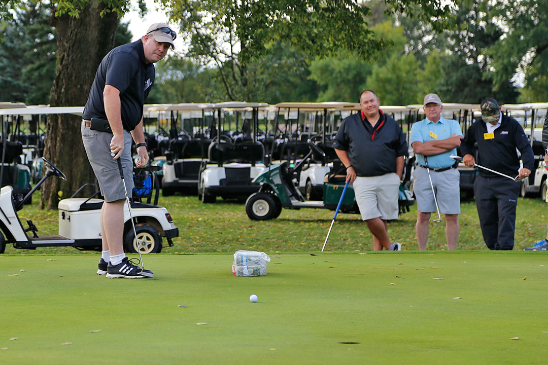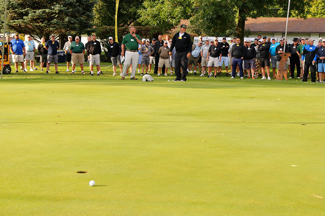 This year's participants were Chase Strong of Hogan & Associates, Ed Moss of Fred Weber, Inc., Jeff McCall of Dragados, Kirk Macemore of Carolina CAT, and Andru Small of Terry Equipment. After a short putt-off hosted by Rich Smith, GOMACO Vice President of Administration and Finance, Chase Strong earned the honor of attempting to sink a 50-foot putt worth $5,000. Chase's putt came within inches, but the prize went unclaimed at #37.
