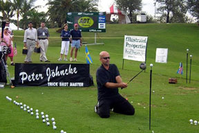 Highlights of his show include amazing drives off an eight-foot tee, hitting balls out of mid air, and keeping the audience involved in excitement! Peter is the current world record holder for scissor hands hitting, which is hitting a row of up to 120 balls with two clubs in his hands non-stop and leaving six to 12 balls in the air at once. Wow!! Peter has been referred to as "Golf's one-man version of the Harlem Globetrotters."