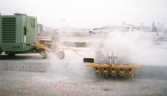 One of the final steps was grooving the runway. FAA standard groove is 6mm (.25 in) depth by 6mm (.25 in) width by 38mm (1.5 in) center-to-center spacing. Grooves were sawed in perpendicular to the direction of landing aircraft.