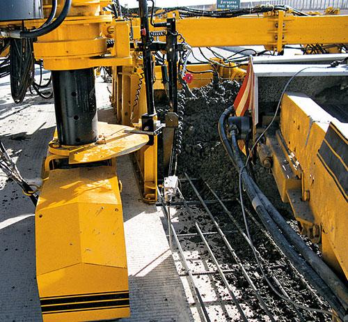 J.D. Abrams took delivery of their new GP-2400 earlier this year. It has been at work on the Border Highway in El Paso ever since slipforming 10 foot (3 m) wide sidemounted shoulder. The scab-on shoulder is 11 inches (279 mm) thick and slipformed over single-mat steel reinforcing.