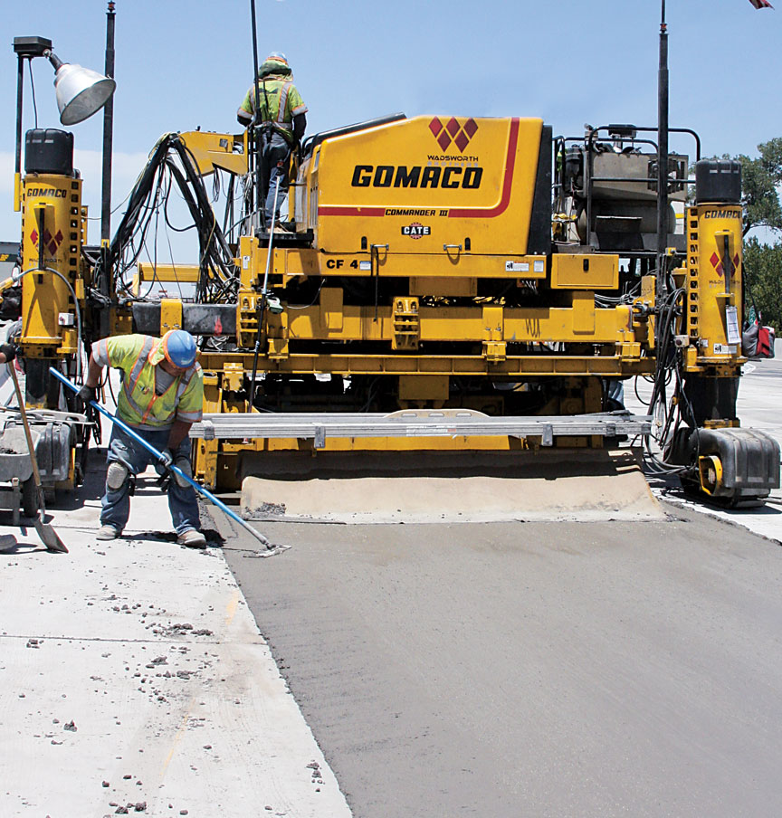 One of three GOMACO 9500 placers on the project works in front of a cantilever, four-track Commander III with a sidemounted mold slipforming a scab-on median.