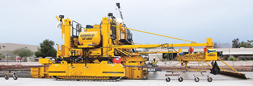 The GP-4000 is paving the passes 24 feet (7.3 m) wide and 15 inches (381 mm) thick. The paver is equipped with three different bar insertion systems, including a front-mounted center bar inserter, two rear-mounted side bar inserters, and the IDBI that inserts the dowel bars for the transverse joint.