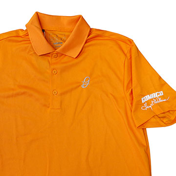 The orange Adidas GOMACO Invitational #41 golf shirt is 100 percent recycled polyester with a hydrophilic finish to wick away moisture. It has a ribbed-knit collar and a three-button placket. The shirt has “GOMACO” and “Gary Godbersen” on the left sleeve, and the “GOMACO Invitational” logo on the left chest.