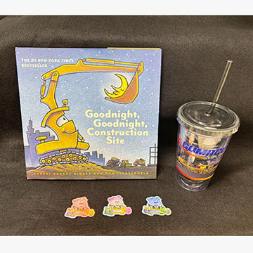 New Item! New York Times’ bestselling author Sherri Duskey Rinker tells the story of the end of the day at the construction site in “Goodnight, Goodnight, Construction Site.” This hardcover book is 32 pages long, and is for ages 2-5. As the sun sets, all the hard working trucks get ready to say goodnight. One by one, the crane truck, cement mixer, dump truck, bulldozer, and excavator finish their work and lie down to rest, so they’ll be ready for another rough and tough construction day. This special bundle includes a GOMACO tumbler with a twister straw, and stickers (stickers may vary).