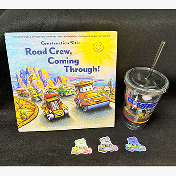 New Item! New York Times’ bestselling author Sherri Duskey Rinker tells the story of seven new road building machines in “Construction Site: Road Crew, Coming Through!” This hardcover book is 44 pages long, and is for ages 2-4. The construction team is taking on their biggest team challenge yet, building a brand new superhighway! With the help of new rough and tough road building machines, the crew gears up for an action-packed day of rolling, building, paving, painting, and all the jobs that go into making a strong new road. This special bundle includes a GOMACO tumbler with a twister straw, and stickers (stickers may vary).