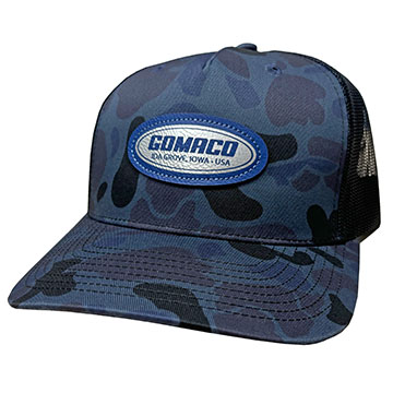 The blue and black camouflage Richardson trucker-style cap is made of 60 percent cotton and 40 percent polyester, and the mesh is polyester. It has a precurved bill and an adjustable snap back closure. It has a silver and blue patch with “GOMACO, Ida Grove, Iowa - USA” on the front.
