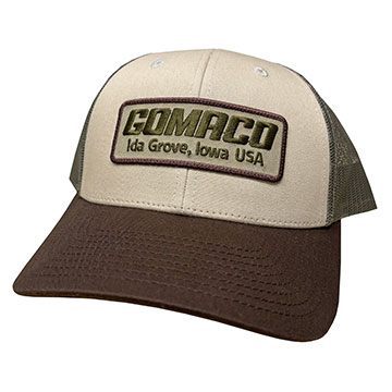 New Item! The tan, green and brown low-profile Richardson trucker-style cap is made of 60 percent cotton and 40 percent polyester, and the mesh is polyester. It has a precurved bill and an adjustable snap back closure. It has a patch with “GOMACO, Ida Grove, Iowa - USA” on the front.
