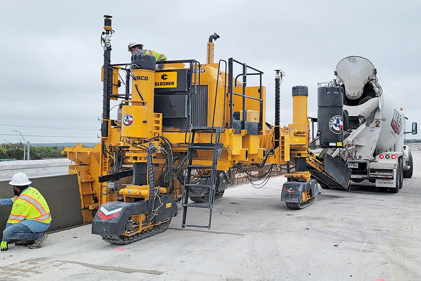 A 3300 with Topcon mmGPS 3D guidance is slipforming concrete barrier over steel reinforcing on a bridge on U.S. Highway 183 in Leander, Texas.
