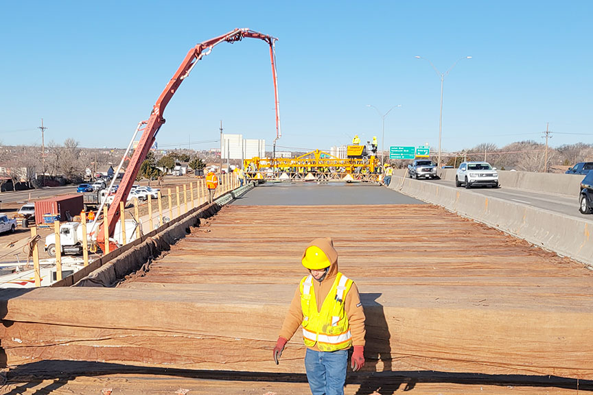 This C-450 with a high-production screed is finishing a bridge deck on the South Crockett Street overpass on I-40 in Amarillo, Texas.