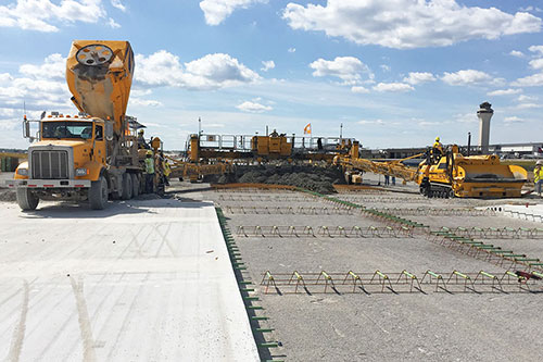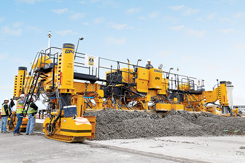 A four-track GP4 slipform paver works on a concrete runway project at the Detroit Metropolitan Wayne County Airport in Michigan.
