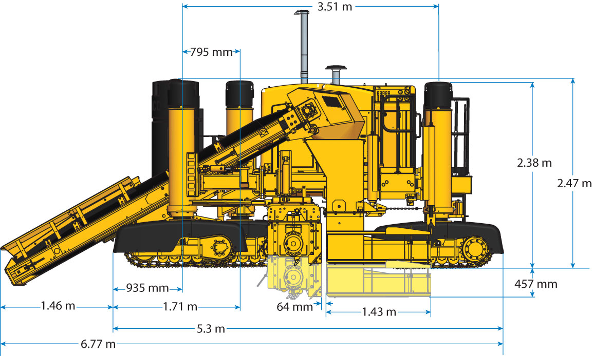 • Lenkbarkeit aller Raupen spart Zeit beim Anfahren und Verlassen der Richtschnur, bei Richtfahrten im Baustellenbereich und beim Laden für den Transport. Die Fähigkeit alle Raupenketten zu lenken, ermöglicht die exakte Lenkung auf engen Radien.