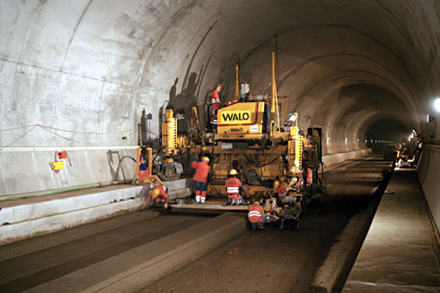 The Perthus Tunnel is the link between Perpignan in France and Figueras in Spain, in the French/Spanish border town of Perthus. Two 28.5 ft. (8.7 m) diameter tunnels, each 5.2 miles (8.4 km) long, are part of the overall link connecting the two countries. The project was paved with a GOMACO Commander III.
