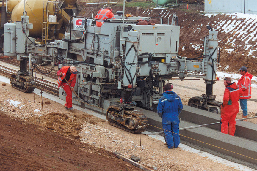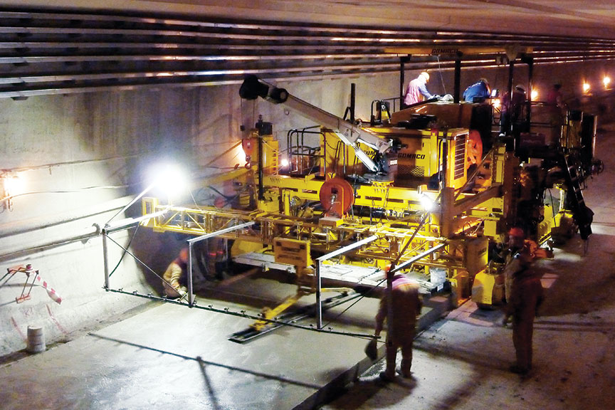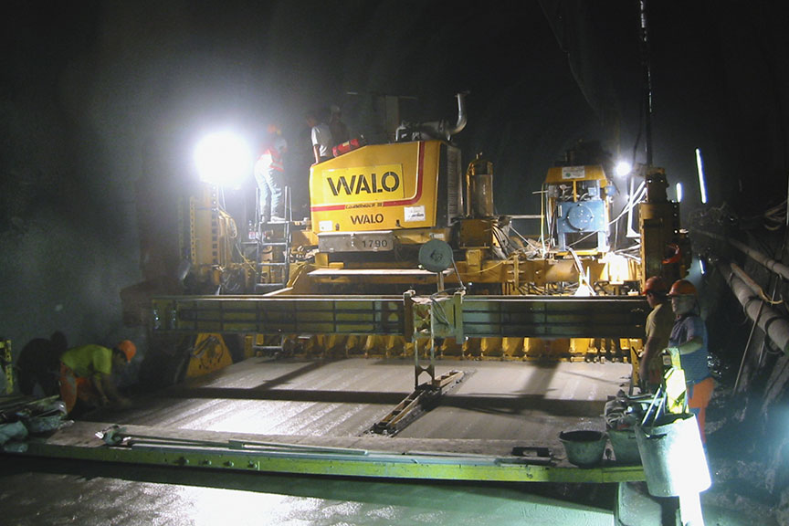 A Commander III, equipped with a 3D guidance system, was used to slipform the floor and two evacuation walkways in the tunnel of the Channel Tunnel Rail Link project connecting London, England, to Europe.