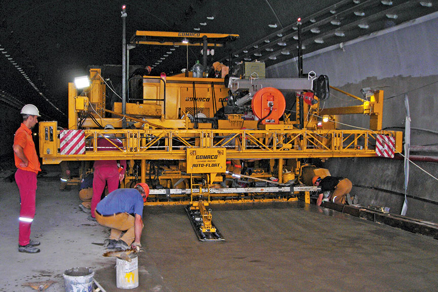 The GOMACO finishing system used in a tunnel that connects France and England included a modified C-450 cylinder finisher, a texturing machine coupled with a walkway machine into one unit, and a rail pick-up machine.