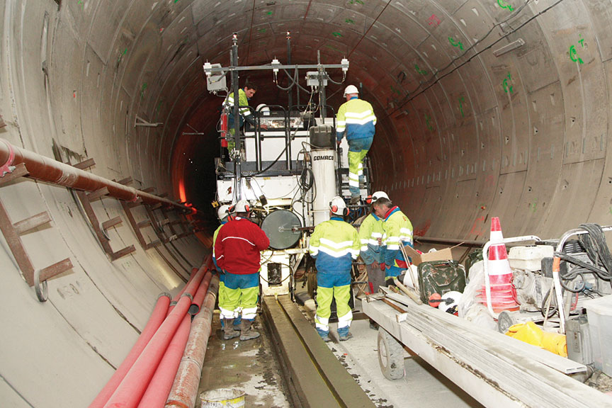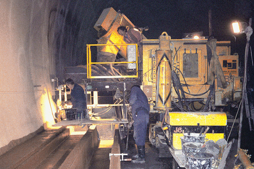 Slotted drain in the Perthus Tunnel between France and Spain is being slipformed by a four-track Commander III.