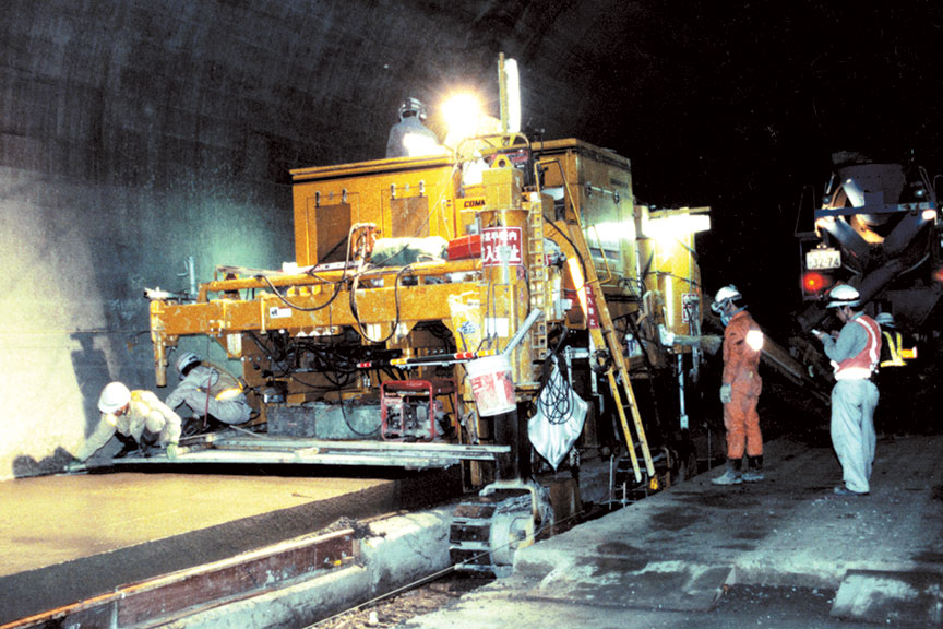 A roadway through Japan's Suzuka Tunnel is being slipformed by a Commander III.