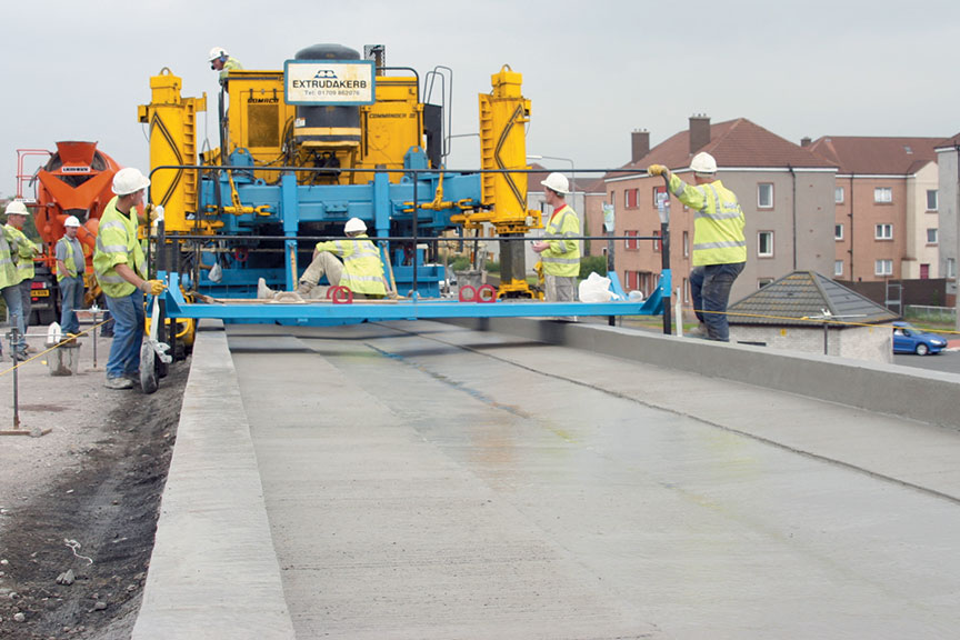 A Commander III was used to slipform busways for the city of West Edinburgh, Scotland. The special profile is for the city’s buses, which have steering mechanisms on the wheels that sense off the curbs for automatic steering capabilities.